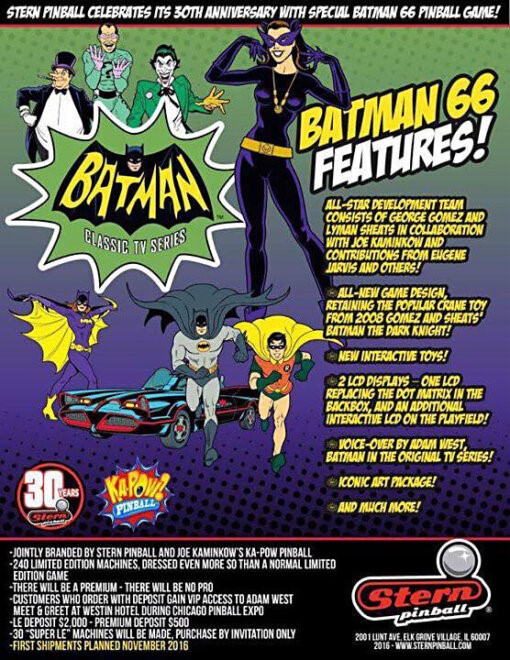 With exclusive Premium elements, immersive theme integration, and dynamic playfield action, Batman ’66 Premium brings the fun, humor, and energy of Gotham’s golden era right into your game room.