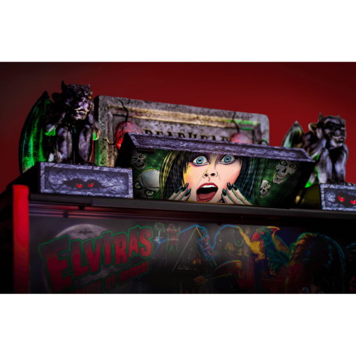 The Elvira’s House of Horrors Pinball Topper by Stern Pinball is an officially licensed, LED-illuminated accessory designed to enhance the visual appeal of your pinball machine. Featuring a dynamic “Deadhead Family Crypt” centerpiece flanked by animated gargoyle sculptures, this topper adds a theatrical flair to your game. It is compatible with all Stern pinball models and includes sound effects that synchronize with gameplay, providing an immersive experience.