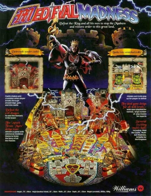 Relive one of the most beloved pinball classics of all time with the Medieval Madnessâ„¢ Pinball Machine by Williams. Celebrated for its clever design, playful theme, and addictive gameplay, Medieval Madness is a fan favorite that continues to delight players, collectors, and enthusiasts worldwide.